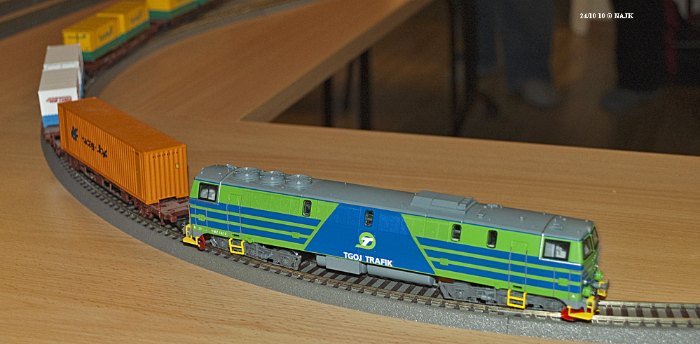Översiktsbild på några olika tåg, majoritetn av dom är containertåg. Nästa bild TGOJ Tmz med vagnar kommer genom kurvan. (Hobbytrade + UGJ + Roco) Högerbilden är på Rocos nya Da-lok. Tackar till alla er som kom och besökte oss till att bjuda på en trevlig och intressant dag. Välkommen åter!