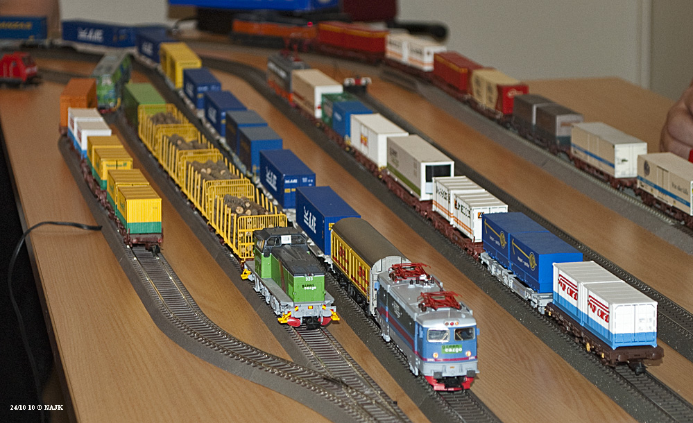 NAJK besöker Skelleftehamn 24 oktober 2010 Den 24 oktober hade vi n lokalträff i föreningslokalen i Skelleftehamn. Så ett glatt gäng från Skellefteå och Luleåtrakten tillbringade några trevliga timmar tillsammans och körde tåg, läste böcker och tidskrifter. Vi snackade även om tåg i olika skalor, både modell och riktiga och utbytte kunskap och insperation. Dagens insperationstema är containervagnar och därför kunde vi titta på och köra en drös vagnar av den modellen. Några av bilder är klickbara och kommer i eget fönster/flik för att kunna ses större. För er med stora eller små skärmar, håll ned CTRL och scrolla med musen mitthjul eller välj plus/minus på tangentbordet för att förstora eller förminska bilden.![]()